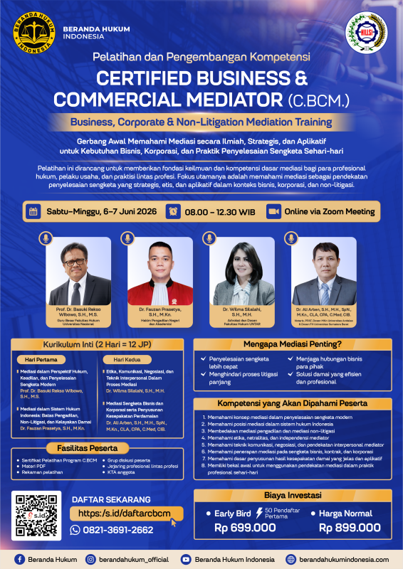 Jika Anda ingin memahami mediasi bukan hanya sebagai teori, tetapi juga sebagai pendekatan strategis yang relevan untuk kebutuhan bisnis, korporasi, dan praktik profesional sehari-hari, maka program Certified Business & Commercial Mediator (C.BCM.) merupakan langkah awal yang tepat untuk diikuti.
